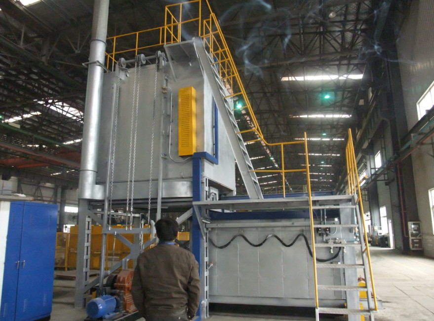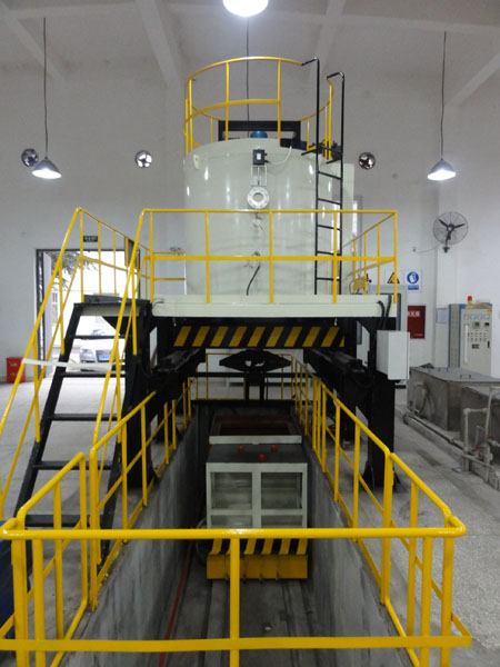 铝合金淬火炉主要用于铝轮毂、铝铸件及各种铝合金标准件的快速固溶处理,恒温时间结束后,工件的转移速度10秒以内。 立式铝合金淬火炉主要由加热炉体、提升机构、装料小车、移动式淬火水槽和壹个淬火料架、温度动作控制等部份组成。炉体主要由壳体、炉衬、加热元件、热风循环及导流装置、料架及料架升降机构、炉底门及气动开启装置等部份组成。炉衬由两部份组成,炉体部份采用超轻质节能砖和硅酸铝纤维板组成的复合型结构。炉顶部份为活动式,采用优质硅酸铝针刺毡作为保温材料,该结构设计合理,具有保温性能好,炉壁温升低,节能降耗等特点。加热元件采用0Cr25AL5铁铬合金制作成螺旋状均匀地分布在炉壁西周围的搁丝砖上使炉内温度均匀。 为了使炉内温度均匀性能够满足铝合金工件的淬火工艺要求,在炉体的顶部还设置.....,离心风扇在炉内导流系统的作用下能够有效地将热气流循环,导流系统采用优质耐热不锈钢板制作。在炉内为了防止其变形,导流板均采用......,其结构性能稳定、可靠、设备长期工作无需维修。 料架的升降均由设置在炉外的起吊卷扬机来完成,该卷扬系统设置双速驱动装料。当炉门打开后,卷扬机自动快速下降,将满载工件的料架迅速入水淬火,当料架上重新准备进入炉内时,卷......架,以有效地防止工件的运动惯性,确保运行平稳、不会损坏炉口的密封装置以及保温材料。 炉门的驱动由气缸来实现。当需要开闭炉门时,手动点机开闭开关由蜗链调速机和电机完成。连.......炉门从滑轨上抬起,压到炉上并封死。当工件满足加热温度需要进行淬火时,气缸迅速抽回炉门,连杆机构放开,使炉门从炉口落下,落至滑轨上并回到炉口外侧,使工件能够从炉内迅速入槽淬火。移动式淬火槽主要由一个上料工位和一只水槽组成。淬火槽设置驱动机构,槽内设置有加热系统、淬火介质循环冷却装置。
